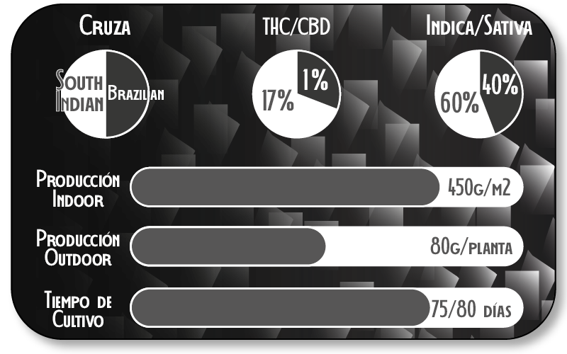 Destaca la solidez y tamaño de los cogollos, literalmente brillantes por su alto contenido de resina. Si no se la somete a ninguna poda desarrolla una tremenda cola principal muy tupida, con una docena de ramas laterales de apreciable tamaño. Se caracteriza por la belleza de sus largos pistilos naranjas.