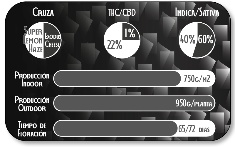 La síntesis sublime de lo mejor de dos mundos cannábicos, Cheese y Lemon. Desde su floración se comienza a percibir la fragancia cítrica que una vez cosechada se disfrutará en boca. Sabores y olores se corresponden mutuamente. Una vez fumada, se acentúa el sabor Cheese de persistente final. Su efecto es altamente mental y estimulante para actividades intensas.
