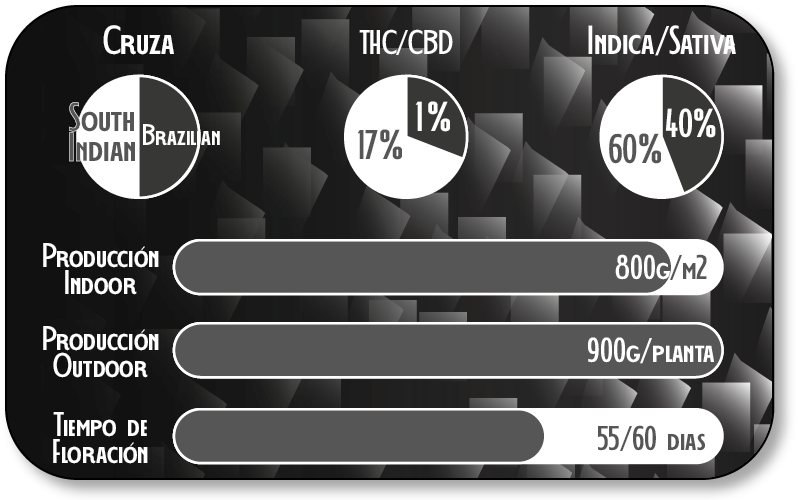 Una auténtica bestia índica de gran producción. Su proporción de terpenos y THC/CBD la hacen especialmente anestesiante, incitando a un viaje de diversión creativa. Sus frutos destacan por su tamaño y solidez, pero sobre todo por una gran cantidad de pistilos que sobresalen notablemente y adquieren, hacia la maduración, un color naranja intenso.